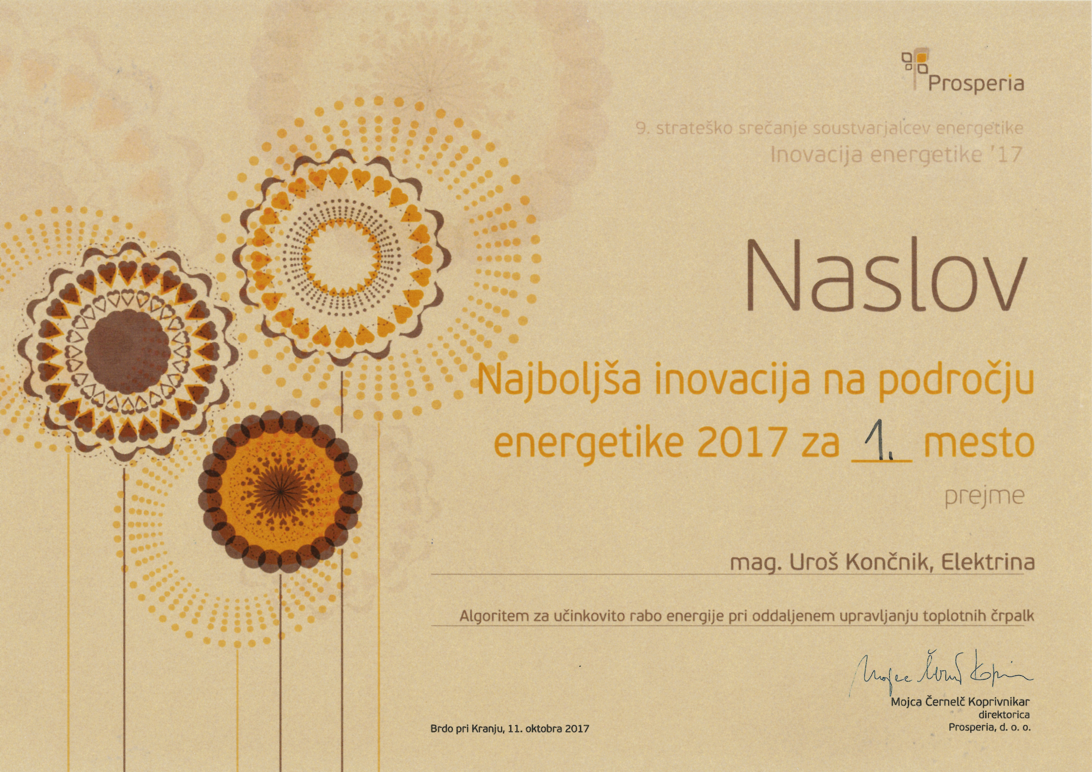 V okviru konference so bila podeljena tudi priznanja in naslov najboljša inovacija na področju energetike 2017. Ta laskavi naziv je po mnenju udeležencev pripadel mag. Urošu Končniku iz Elektrine za predstavitev Algoritma za učinkovito rabo energije pri oddaljenem upravljanju toplotnih črpalk.